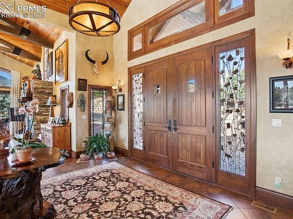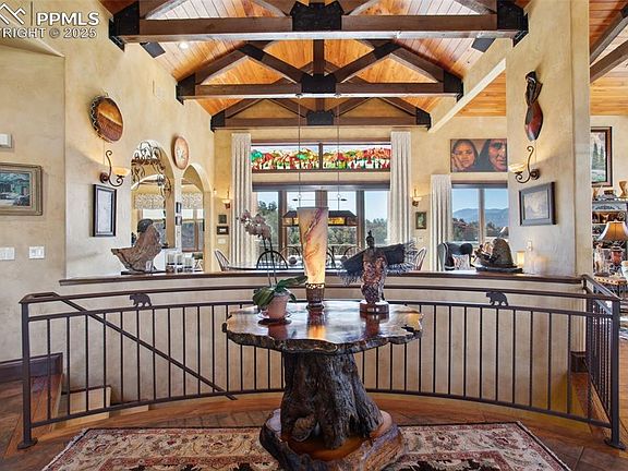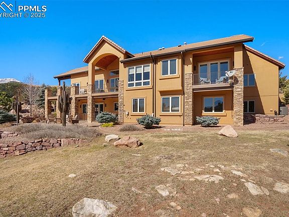 Welcome to this extraordinary custom ranch-style home with 5 bedrooms & 7 baths, nestled on 3.25 acres of immaculately landscaped property in a prestigious gated community in Colorado Springs. Breathtaking views of Pikes Peak and the surrounding mountains, this residence offers the perfect blend of luxury and mountain living. As you step inside, the open and inviting Great Room captivates you with custom wood beams, metal work, hickory wood floors and 8" custom knotty alder trim. Gas fireplace wrapped in custom finish. The chef’s kitchen is a masterpiece for all with gas range, SubZero refrigerator, two dishwashers and pantry. The custom vent hood and center island enhance both style and function. The light & bright home command center off the kitchen offers versatility to fit your lifestyle. Access to the covered wrap around deck on two sides offers tremendous outdoor living. The epitome of luxury in the primary suite, is a sanctuary that leaves nothing to be desired. This spacious retreat features a private walk-out to deck with breathtaking views. Custom gas fireplace invites relaxation, making it the perfect spot to unwind. The spa-like primary bath includes walk-in shower, luxurious bath, dual vanities and custom cabinetry. The custom finished master closet offers access to laundry nearby. Secondary bedroom with ensuite bath, 1/2 guest bath & laundry are on the main. Downstairs includes huge family room with gas fireplace and wet bar perfect for entertaining. 3 bedrooms with ensuite baths, custom office with built ins, private access to the backyard and huge storage area are also here. 8-inch knotty alder molding and LED lighting. Outdoor living is not to be denied with covered deck on two sides; enviable gardens, rock water feature borders open space, ensuring privacy and unobstructed views. This property is truly one-of-a-kind, offering luxurious living with meticulous attention to detail.