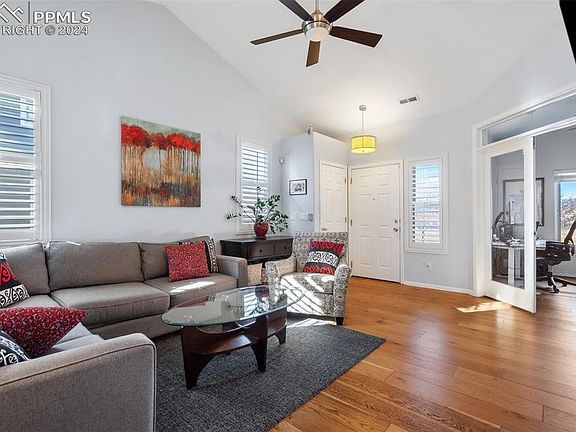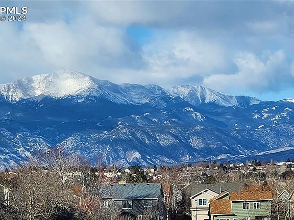 Welcome to this charming 3 bed, 2 bath home with breathtaking mountain views and a picturesque view of Pikes Peak. Nestled against an open space, this property offers the perfect blend of tranquility and natural beauty. As you step inside, you'll be greeted by the warm ambiance of wood flooring, complemented by 9ft ceilings that create an open and inviting atmosphere. The living room features a cozy gas fireplace, perfect for chilly evenings. Adjacent to the living room is a versatile bedroom with French doors, offering the flexibility to be used as an office or guest room. The eat-in kitchen boasts tile flooring, quartz counters, and modern finishes. It also conveniently walks out to the low maintenance artificial turf backyard, making outdoor entertaining a breeze. Speaking of the backyard, you'll find a beautifully landscaped oasis complete with turf, a deck, and a wood-burning fire pit. Enjoy the serenity of nature while relaxing or hosting gatherings in this private outdoor space. The master bedroom has been tastefully updated and features an attached en suite bathroom. Step into the luxurious walk-in shower with glass doors, unwind at the double vanity, and appreciate the convenience of a spacious walk-in closet. Ceiling fans throughout the home provide comfort and energy efficiency. With its stunning views, and thoughtful features, this home offers the perfect combination of style, functionality, and natural beauty. Don't miss the opportunity to make it yours.