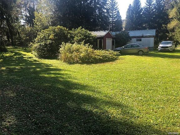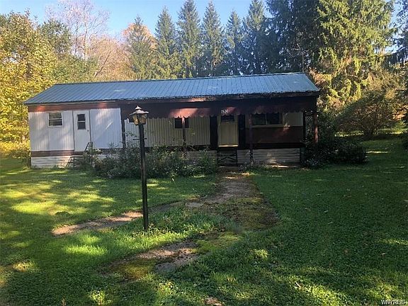 Well-maintained older double-wide situated on 8 acres with road frontage on Route 305 and Jordan Hill Road. Two bedrooms with third possible. One car attached garage. Large enclosed breezeway from garage into house. No fighting the winter weather when you get home!! Large L-shaped dining and living room area. Cozy galley kitchen includes stove and refrigerator. Perfect for one floor living or downsizing.