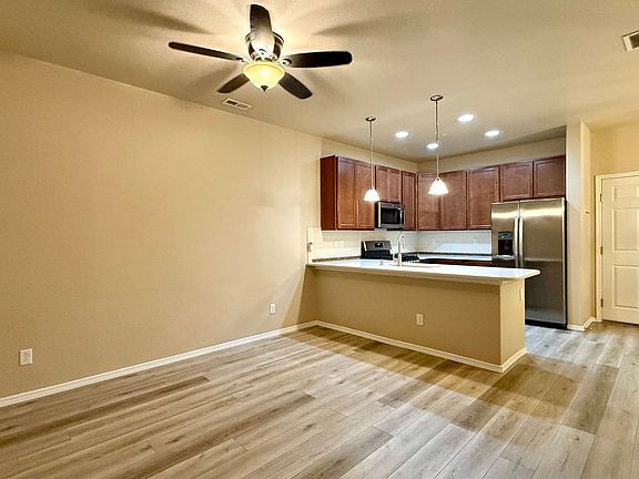 Primary suiteContemporary interior featuresBacks to open spacePeninsula counterWalk-in closetAbundant cabinet spaceLaundry facilities