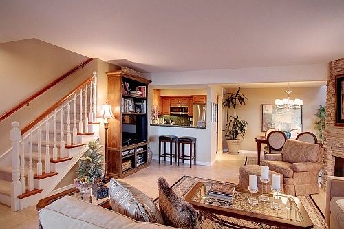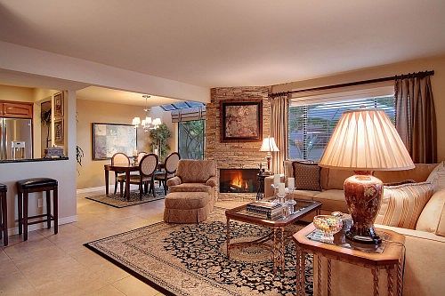 Gorgeous highly remodeled 2 story town home offers 2 bedrooms and 2.5 baths. Custom designed kitchen features maple cabinets with granite counter tops and GE Profit stainless steel appliances. Energy efficient Milgard windows and a sliding glass door to the serene private patio that offers lush plants and a quick walk to your 2 car detached garage. The master suite features an elegant custom bathroom with maple tired dual sink vanity with grantie tops. Custom banister, recessed lighting T/O and stacking stone custom ceiling fireplace in livingroom. Elegant touches throuhgout this home. Walk to the many pools and spas.