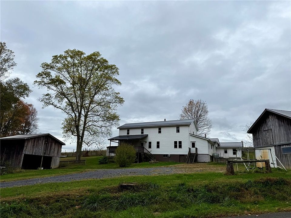 Peaceful country farmstead on 3.187 acres with a spacious five bedroom farmhouse and multiple barns and outbuildings. The home is currently operational without electricity and features a motor powered water well and septic or holding tank. It is wired with an electrical panel allowing for easy connection to main electric service if desired. Several garden areas are ready for planting and there is plenty of space for animals, equipment, or workshops. A large front porch overlooks open fields and rolling countryside. This working farm offers flexibility for off grid living, traditional agriculture, or small scale homesteading. A rare opportunity to enjoy a simpler, self sufficient lifestyle in a beautiful rural setting with room to grow, work the land, and make it your own.