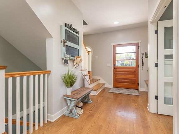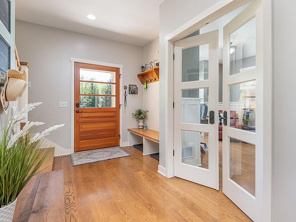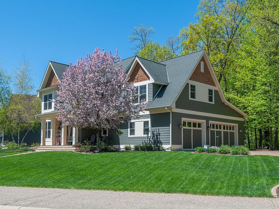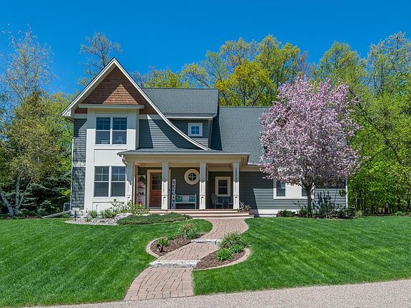 This Kyle Hunt custom designed home is located in desirable North Saunders. You will appreciate the wonderful cottage roof line and a front porch greets guests. Inside you will discover beautiful hardwood floors, custom cabinetry and millwork, and Andersen windows. The center island kitchen features Alder cabinetry, double ovens and cooktop with hood. The great room offers a gas fireplace, surround sound and French doors lead into an office/bedroom. Upstairs you will find 3 large bedrooms including the owners suite, a study area and laundry room. You will love the mudroom with lockers and 3 plus stall heated garage with workshop space. The lower level bar is finished in Cherry and granite and has a wine cellar, fridge and dishwasher. There is space here to add an additional bedroom or office. Relax outside on the deck or patio overlooking the private wooded back yard. You are just steps from the Dakota Trail plus a boat launch and shopping are close by. Outstanding Westonka Schools!