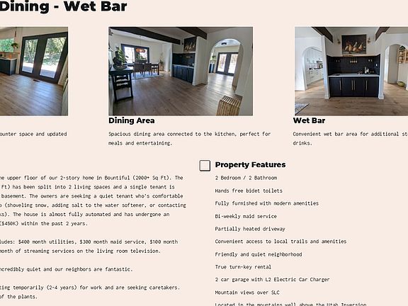 This listing is for the upper floor of our 2-story home in Bountiful (2000+ Sq Ft). The entire house (3300 Sq Ft) has been split into 2 living spaces and a single tenant is currently renting the basement. The owners are seeking a quiet tenant who's comfortable with basic home upkeep (shoveling snow, adding salt to the water softener, or contacting us when anything breaks). The house is almost fully automated and has undergone an extensive renovation ($450K) within the past 2 years. Your monthly rent includes: $400 month utilities, $300 month maid service, $100 month internet access, $40 month of streaming services on the living room television. The neighborhood is incredibly quiet and our neighbors are fantastic. The owners are relocating temporarily (2-4 years) for work and are seeking caretakers. We'll be taking most of the plants. This is a separate living space with private entrance, parking, washer/dryer, bathrooms, kitchen, and living spaces. You will live separately above our other tenants, but are free to rent the entire house in May for $5K deposit/$5K per month. Thank you. The monthly rental price is $3000 per month for a 12 month lease. All utilities are included in the rent (water, gas, electric, trash, internet) and the house comes fully furnished. We kindly request that you keep electric, gas, water usage to under $400 per month. We run 2 electric cars and keep the house at 72-74 degrees without going over that limit (3 adults). 1 TB per month of internet access is also included. Utilities are shared with the basement tenant.