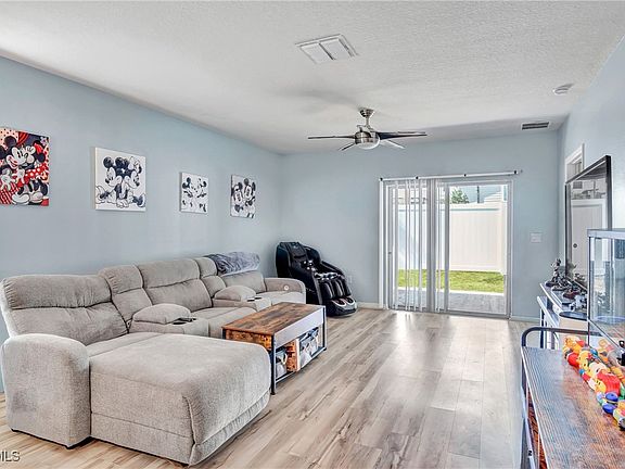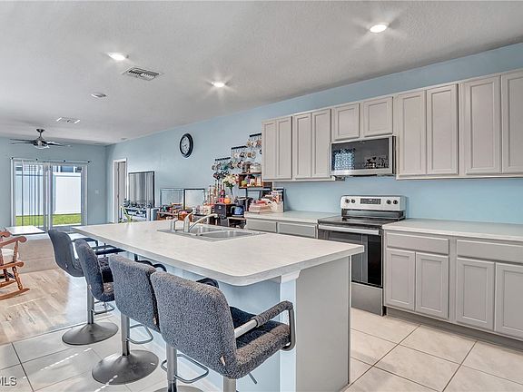 The heart of the home is the open kitchen overlooking the dining area and great room, complete with an oversized island with bar seating, generous cabinet and counter space, and stainless steel appliances, perfect for both everyday living and entertaining. Large windows and sliding glass doors bring in abundant natural light and lead to your covered lanai, extending your living space outdoors.