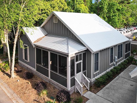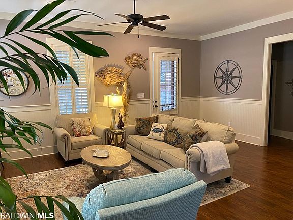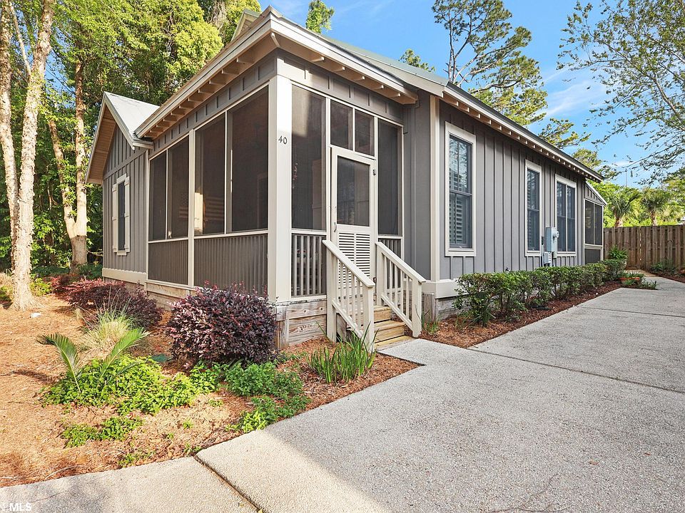 This beautiful, cozy cottage is being sold furnished with everything you need to move in and start living the dream. This adorable 2 bed/2bath cottage has a huge primary bedroom and bath, spacious open concept living area, high ceilings with crown molding, Plantation Shutters throughout, hard wood and tile floors (no carpet), stone countertops, stainless steel appliances, and a separate laundry room. New roof in 2022! Not just one, but 2 screened porches-a large welcoming porch in the front and a more private one out back, where you can enjoy evening music from a neighboring restaurant. This cottage has no adjoining neighbors on the left or rear and has a privacy fence. It's one of the more secluded and private cottages in the neighborhood. There's a back deck and a large outdoor storage room for all your boating and beach toys. In this charming bay front community, conveniently located in the heart of Orange Beach, you have two outdoor pools to enjoy (one bayside and one just steps from your front door), a marina with boat slips and lifts- available for lease at only 10K (upon availability) some slips are first come, and a beautiful clubhouse-with a fireplace, kitchen, lounging area, rocking chairs and swings, all for your enjoyment. The Fish Camp is just steps from Cosmos, Luna's, Buzz Cats, and just across the street from Big Fish and shopping. At this price with all of this is a rare find! Fish Camp has a 30 day minimum rental policy.