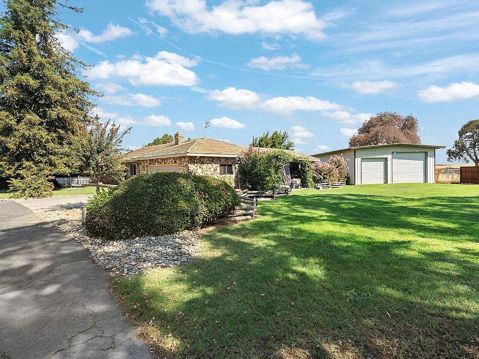 Welcome to this lovely, updated, private ranchette style home. Offering a fenced acre with garden beds for those of you with a green thumb, lots of beautiful green grass, apricot, peach and nectarine trees. Plenty of space for your favorite farm animals. Nested on an acre at the end of the street. The kitchen has Sparkling granite countertops with stainless appliances. Newer laminate flooring and recessed lighting. Did I mention the huge 50 X 32 metal insulated shop, with 2 large automatic roll up doors, And room to park your RV, Boat or other toys. Located 8 miles from Highway 99, in between Galt and Lodi. 20 minutes to Lake Camanche. In the highly desirable Oak View School District. Welcome home.