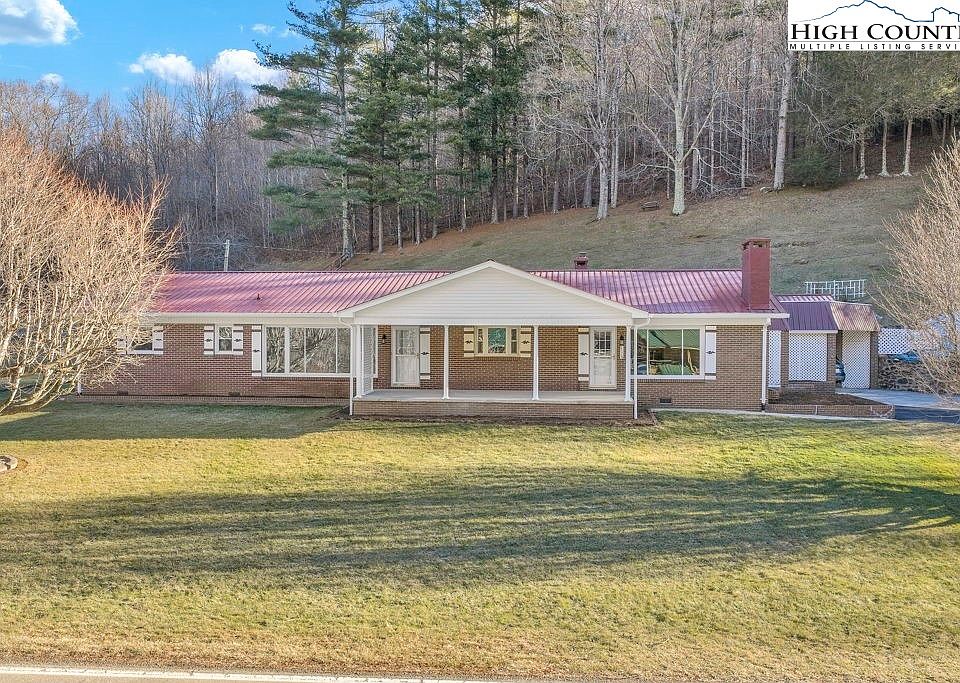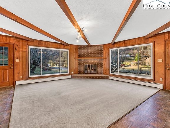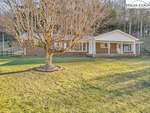 Well-maintained, single-level brick home offering comfortable living with thoughtful features throughout. This 3-bedroom, 2-bath residence features a large kitchen with abundant cabinet space and passthrough to the living room, a big electric range with hood vent, bay window, and adjoining dining area with gas log fireplace. The spacious parlor with large windowns and ample sunlight, wide hallway, and generous closet space enhance everyday functionality. Flooring includes vinyl and carpet, LVP, Torigal flooring, counter tops, & walls. The primary bedroom offers a walk-in closet and ensuite bath. The laundry room functions as a mud room to the garage and includes a utility sink. Additional highlights include double-pane vinyl windows, storm door, crawl space, and an electric water heater. Heating options include oil baseboard heat (above-ground tank), a wood-burning fireplace ( stone / Brick ), gas logs, and a woodstove in the garage. A propane heater with stone surround is also located in the garage (no propane tank installed). The home features a durable tin roof (approx. 18 years) plus a recently updated flat roof section, along with newer gutters. Exterior amenities include a paved driveway, double garage doors with access to the rear yard, covered front porch, covered workshop space, and a level yard. Septic system is located at the rear of the property. The well is positioned to the right of the driveway and includes an iron filtration system serviced by Brooks Heating & Plumbing. Property experienced no known issues during Hurricane Helene. One-owner home with pride of ownership evident throughout. Enjoy a peaceful setting with a stocked Meat Camp Creek across the road, just 5 minutes to Elk Knob and approximately 15 minutes to Boone situated over 3,400 ft above sea level.