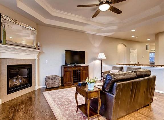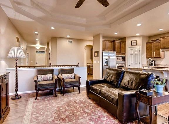Upgraded Walkout Ranch Home w/ 3-car garage. Large main floor master-additional seating area and trey ceilings. En-suite bath-split vanity, and tiled floors. Plenty of space, with the two large secondary bedrooms. French doors lead to the office/den with a closet (possibility for 4th bedroom). Gourmet Kitchen with granite counter top, five-piece stainless steel upgraded appliances-gas cook top and upgraded cabinetry. The kitchen opens to the family room- trey ceiling and a gas fireplace. The Dining Room features an attached butlers bar and hardwood floors. Enjoy the deck or on the oversized patio below. Oversized Patio includes a built-in stone fire pit, hot tub electrical hookup and concrete path leading to the garage side door. Special features to enjoy are the views of the bluffs, neighborhood pool, fitness facility, community park/playground, nearby Rhyolite Park. Located just minutes to downtown Castle Rock, golf courses, I-25 access, restaurants, hiking and biking trails.