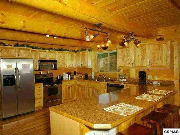 Custom built beautiful log home with no expense spared to make this a one of a kind. Huge exposed log beams throughout, all tongue and groove no drywall anywhere, real wood floors on first and second level, carpet in bedrooms, theatre room and game room, tile in baths, 2 large master suites both with french doors to deck as well as huge baths with whirlpool tubs in both, 3rd and 4th bedroom on lower level with queen beds, Game room has full size bar with refrigerator, arcade game, pool table, casino table, sleeper sofa, theatre room with projector and huge wall screen with surround should and theatre seating, living room with stack stone gas fireplace, wall of glass for the views, sleeper sofa as well as separate sitting area for reading, kitchen has custom made cabinets and counter tops with all stainless steel appl. and wraparound bar for extra seating, dining room with huge solid wood table seats 8. Full wrap around deck on main level with upper private deck off bedroom and wraparound patio down with hot tub. Cabin decor with upscale furniture and paintings from local artists. Too much to say a must see. All on 1.37 acres within minutes to Pigeon Forge.
