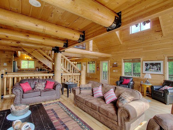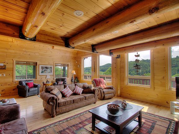 whirlpool tubs two queen bedrooms totaling 4 bedrooms with 3 full baths and one half bath oversized custom kitchen with stainless steel appliances and custom made real wood cabinets. Large living room with 65" flat screen TV and separate reading area, dining room will seat 11, private deck off upper master complete wrap around deck on main level with entrances from master bedroom, master bath, kitchen and living room, lower level is full of fun with separate theater room with real theater seating and projection TV, game room with pool table, arcade game, casino table, bar w/frig. private hot tub. No drywall in cabin at all all tongue and groove, wood floors throughout. Upscale furniture and decor in every room.