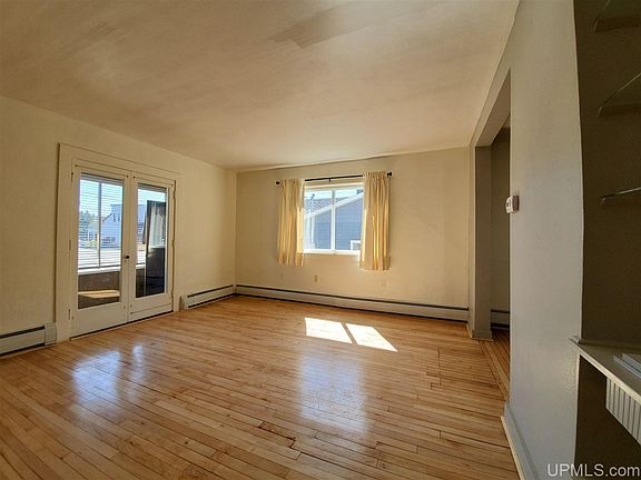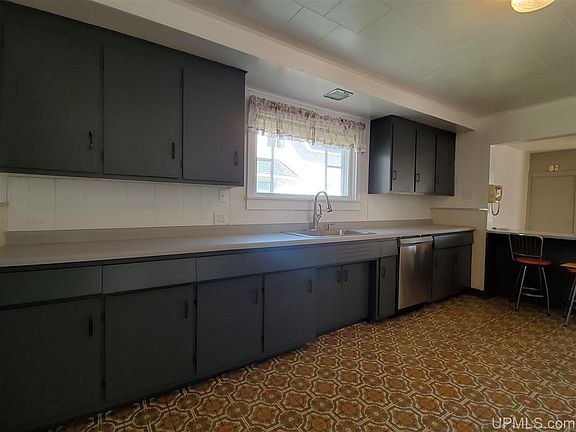 Bright, sunny, spacious. Nicely updated and remodeled home in the heart of Calumet. The main floor features an open concept and gorgeous refinished hard wood floors. From the enclosed front porch, French doors lead into the living room. Modern glass shelving separates the living room and dining room and a cool retro breakfast bar separates the dining room and kitchen allowing the whole family or all your friends to enjoy an open, communal space. The kitchen features new stainless steel appliances (never used), new over-sized stainless steel sink and faucet (never used), and plenty of counter space and cupboards. A full bath and laundry room round out the main floor. Upstairs you'll find 3 bedrooms, a bath with shower, and a large common room which is a great space for an office, play area, or reading nook. The upstairs bathroom and back bedroom were recently remodeled and feature warm tongue-in-groove paneling. The back bedroom has a -closet with plenty of space to hang shirts, folded pants, or skirts. Watch the world go by from the sunny enclosed front porch. The spacious enclosed back porch has access to the basement and provides a great place for storage. There is a 1- car attached garage with automatic overhead door accessible from the front porch and basement and a 1-car detached garage. There is a work bench with tool (included) in the basement. Contents in detached garage are not included. This is a great home for you or easily rentable to tenants and as an Air BnB. You are within walking distance to schools, the football field, shopping, parks, downtown, the Calumet Theatre, and all of the fun activities held in Calumet like the Copper Dog sled dog races, Pasty Fest, parades and more.