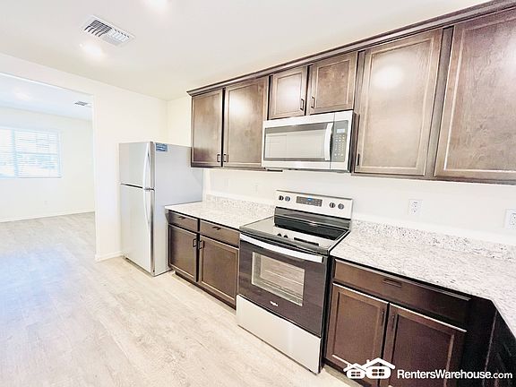 This alluring single-story ranch, constructed in 2022, seamlessly blends modernity with appeal. The home features a desirable layout that includes a dining room/den offering a picturesque street view, which flows into a stunning chef's kitchen adorned with elegant cherry cabinets and granite countertops, complete with a full-size pantry. The kitchen also boasts a breakfast bar that opens to the living room. The primary bedroom is located at the rear of the home and includes an en suite bathroom along with additional closet space. The ensuite features built-in shelving, and there is an extra hall closet conveniently situated just outside the bedroom door. The secondary bedrooms and bathroom are accessible from the living and kitchen areas. These generously sized bedrooms provide ample storage, featuring large sliding door closets. The spacious rear covered patio is perfect for a dining set, grill, and fire pit, all situated on an oversized lot with block fencing enclosing the backyard, ensuring privacy with no rear neighbors. This residence is conveniently located just a short distance from the unique and eclectic downtown area of Buckeye, near MC 85, and in close proximity to the original post office and local fire station. As a neighborhood resident, you will have access to a variety of amenities, including the highly-rated Earl Edgar Recreation Center, Buckeye Aquatic Center, Hidden Lake, and Buckeye Lake Ladder Pointe, as well as fresh farmers' markets and local butchers, including prepared meals from Arlington Cattle Co. Don't miss out on the opportunity to make this your new home sweet home! Presented by Renters Warehouse & (MrWestValley)- Marquis Adams. No smoking. Rent is $1800 / month + 4%/tax/processing fee. There's a one-time security deposit is $1800. One-time lease admin fee of $199. Rental criteria is: 3X month rent- for income to rent ratio of ($5,400) min household income. 560 min credit score, no evictions, judgements or negative rental history in the past 5 years. All occupants 18+ must apply. $60 non-refundable application fee. Renters Insurance is Required. Monthly Pet Rent of $40 per pet. Lease Terms 12 months + If you want to schedule a showing, or have questions- For All Your HOA Covenants, Conditions, & Restrictions Contact: Associated Asset Management (AAM) Terravista-Buckeye Community