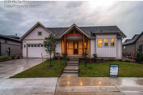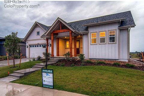 NEW PRICE-Ranch style home completed w/landscaping, sprinkler system front & back, upscale interior finishes, partially fin walk-out lower level w/rec rm & 1/2 ba, 3 car tandem garage, large covered front porch, huge back deck, side courtyard patio & lower level patio. Upgraded kitchen w/SS Bosch appliances. Home backs common area/greenbelt. Required $85 per month maintains the frontyard landscaping & front snow removal. Enjoy pool/club house/walking paths/2 lakes at The Lakes at Centerra.