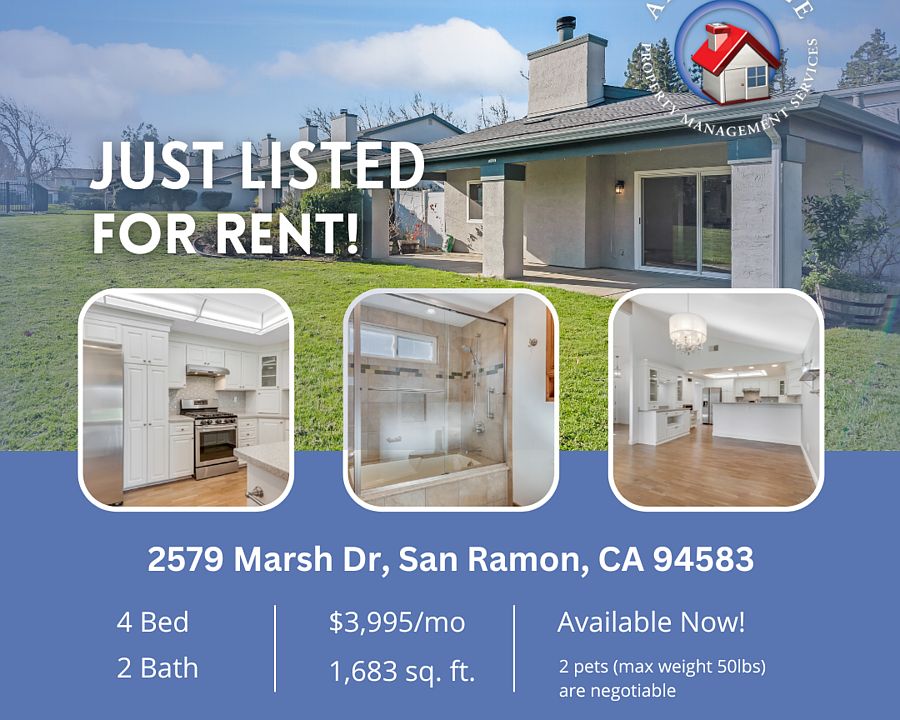 Schedule a Showing Online Come to see this unique 4 bedroom, 2 bathroom 1,683 sq. ft. townhome in the highly sought-after Twin Creeks neighborhood of San Ramon. Off the front entrance is the spacious living room which offers vaulted ceilings, a cozy gas fireplace, and large windows for great natural light. The adjacent dining room comes with built-in cabinets and a sliding glass door leading to the large covered patio that opens out onto the community greenbelt with community pool. The upgraded kitchen comes with stainless steel appliances, including a gas oven and dishwasher, stone countertops, and tons of cabinet space. The fully carpeted master bedroom has 2 large closets and an ensuite bathroom that includes a beautiful tub/shower combo. Across the hall from the master bedroom is the interior patio area. Down the hall are the three additional bedrooms, and second full bathroom with tile floors and a standing shower. The home comes complete with a two car garage and washer and dryer included. The neighborhood offers easy access to the 680 freeway and is in close proximity to stores, cinema, and restaurants. It is also located in the top-rated and sought-after San Ramon Valley Unified School District. Available for move-in ASAP Rent: $3,995.00 /month Security Deposit ranges from $4,995.00 - $7,990.00 unless you qualify for our zero security deposit option provided by Obligo. Applicants that do not meet all the Basic Criteria, but exceed the Minimum Criteria, may be approved with a higher security deposit. If you join Obligo, you will not be required to pay a security deposit! Minimum Lease Term: 12 months Preferred Lease Term: 24 months Pet Policy: 2 pets max weight 50lbs are negotiable with a $500/pet security deposit increase and a $30/month pet admin fee for the first pet plus $20/month for additional pets. Applicants with pets are required to submit a pet application through a third-party pet screening service at https apms. Refrigerator: Included Washer/Dryer: Included Gardening: HOA Responsibility Parking: 2-Car Garage Utilities: All utilities are Tenant responsibility Showings are available by appointment only. Schedule a showing online by clicking the Schedule a Showing link. The property is professionally managed by Advantage Property Management Services. Leasing Contact: Harrison Smith (DRE# 01902063) READ THIS IMPORTANT INFORMATION BEFORE YOU SCHEDULE A SHOWING There is a $50/adult non-refundable application fee and ALL adults residing in the property must apply. We will (1) verify your identification; (2) check your credit report, unless you receive a Government Rent Subsidy and request to provide verifiable alternative evidence instead of a credit report no later than when the application is submitted; (3) verify your household income and employment, if applicable; and (4) verify your rental history with previous landlords. Most applications are processed in 2-3 business days from the date we receive a completed application and all supporting documentation. Security Deposits are calculated using a risk-based model. Applicants who meet all the Basic Criteria may be approved at the advertised security deposit amount. Applicants who do not meet the Basic Criteria but exceed the Minimum Criteria may be approved with a higher security deposit, not to exceed the legal maximum. We offer a security deposit-free option for qualified tenants using Obligo billing authorization technology. Security Deposits for active-duty military and properties subject to AB12 cannot exceed 1x the rent. Prior to move-in, proof of a current renters insurance policy with APMS listed as an Additional Interest and coverage of at least $300,000 for personal liability must be provided. Please DO NOT APPLY if your credit score is below 650, your household income is less than 2.5x the asking rent, you have ever been evicted, you have negative rental history, or your pets do not comply with this property's pet policy. If you have a Government Rent Subsidy and elect to provide verifiable alternative evidence of your reasonable ability to pay rent instead of a credit report, you must inform APMS when you submit a rental application. Failure to notify us at this time may disqualify you from participation in alternative verification. We will provide a list of required documentation after we receive a request. All documentation must be provided within 48-hours. Contact us to learn more about this process and the required documentation. All verifiable sources of income will be considered. Pursuant to CA Gov. Code 12955(o), the income multiple is based on the amount of rent that will be paid by the Applicant (not the total rent amount) if the Applicant has a rental voucher or other housing subsidy. To help ensure all residents understand our animal policies, all Applicants must submit an animal application at https apms. All Information Deemed Reliable But Not Guaranteed. APMS is not responsible for content published by third-party listing websites (i.e. Zillow, Trulia, Hotpads, etc). Central Heat/Air Community Pool Community Pool/Spa Disposal Pets Allowed Refrigerator Included Washer/Dryer In Unit Washer/Dryer Provided