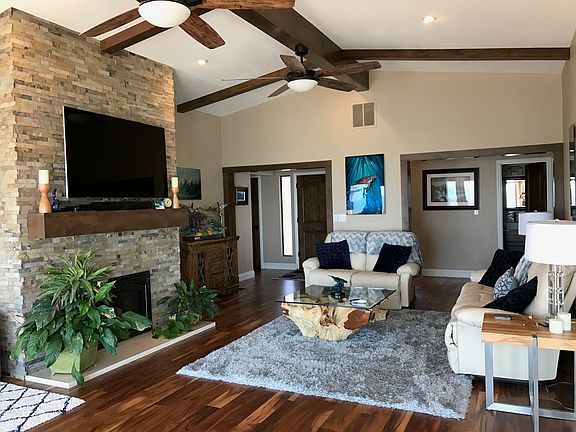 - Recessed Lighting, Beamed Ceilings, Granite Counters, Living Room Deck Attached, Open Floorplan, Ceiling Fan(s), Built-in Features, High Ceilings