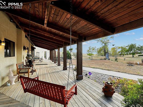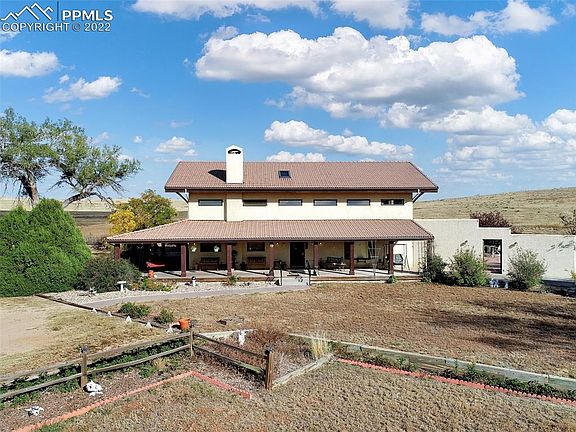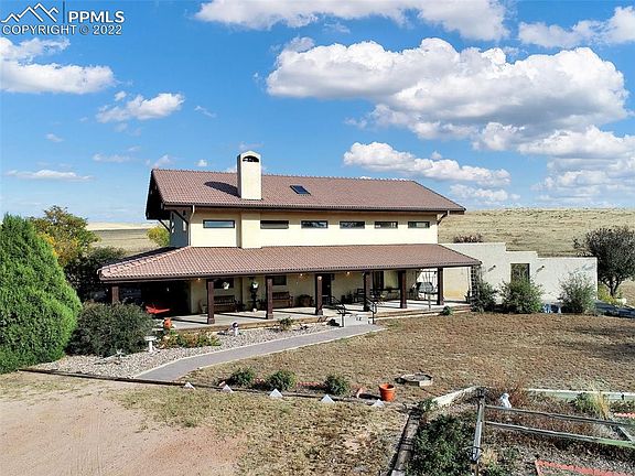 Absolutely amazing 50 acres fenced property with seasonal pond and trees, only 15 minutes to Falcon, 30 minutes to downtown Colorado Springs. This custom built home is overflowing with pride of ownership and unique features. The main level has two living rooms, one can easily be converted to main level master bedroom with it's own entrance and fireplace. There are two bedrooms on the second level and an office and a bonus loft bedroom/storage room above one of the bedrooms. 13 foot deep covered deck runs entire two sides of the home and 2 huge paved courtyards one with built-in chimney/firepit/pizza oven. The huge 3 car garage/shop (38X25 sqf) is heated and fully insulated, with rough-ins to add bathroom, and finished upstairs room 36 X 15 feet with tons of storage closets along both sides of the walls (see photos) This amazing home is a must see. Words cannot do it justice.