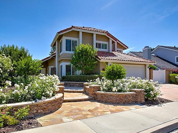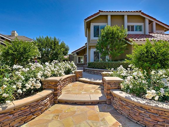 Impeccable Curb Appeal! A carpet of roses greets you, opening to gorgeous custom stonescape and wrought iron courtyard entry. Renaissance solid wood doors open to an absolutely wonderful home offering 4 bedrooms including 1 on the main level, 3 baths, and a large bonus room(can be 5th bedroom). Remodeled kitchen boasts Canter Supreme Champagne Limestone counter-tops, Kraftmaid cabinets, self-closing cabinet drawers, lazy susans, walk-in pantry, and breakfast nook. Well appointed upgrades and enhancements include; Ivory Travertine flooring throughout the downstairs, American Vision Anlin windows, High grade - Full Copper re pipe (hot and cold), Halo Water Filtration System, Wood Plantation Shutters, custom reeded glass shower and closet doors, beautiful master bath remodel featuring Giallo Provenza Limestone surfaces, Carrier 5-Ton/16-Seer AC unit, and much more. Exterior features include fabulous 10 person party spa with sheer descent waterfall, Flagstone BBQ Center with Seating Bar, Jandy One-Touch Spa and lighting controls, Elietewood Insulated patio cover, and a huge side yard - with potential RV storage! Easy walking distance to shopping, restaurants, and Montanoso Recreation Center. And, this wonderful home sits within the boundaries for highly desirable Mission Viejo High School- just a few blocks away. Welcome Home!