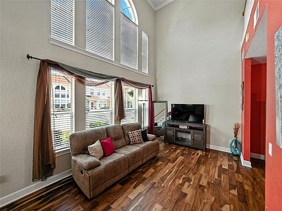 Elegant crown moldingEnd-unit townhouseEngineered wood flooringSerene pond viewsHurricane-tinted windows