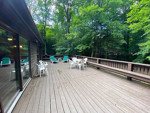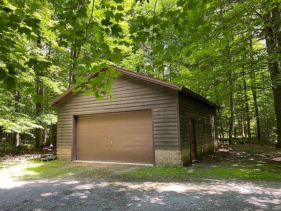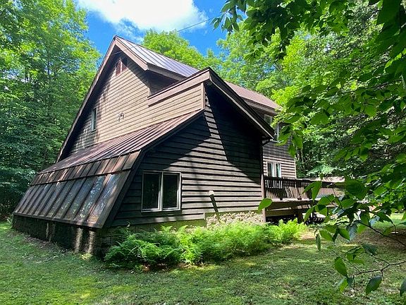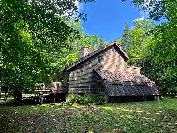 Almost 5 acres of hardwoods surround this Adirondack chalet and garage. Total privacy can be yours in a year round home with three floors of living space. Master Bedroom and bath on the first floor, plus kitchen, living and dining room offers one floor living. The massive granite fireplace with insert in the living room provides additional heat to the baseboard hot water heat throughout the home. An real bonus is the huge hot tub or plant room with entrance from the kitchen. It brings in sunlight all day and adds additional living space. Upstairs are two more generous bedrooms and bath. One bedroom even has its own jacuzzi tub. The finished basement has a woodstove and a bar setup for parties and get-togethers. There is a detached, two car, drive thru garage and a wood shed for tools. The two decks, one on the front and the back offer plenty of places to entertain outdoors or just have quiet enjoyment.In the winter, the snowmobile trails are right out your drive.