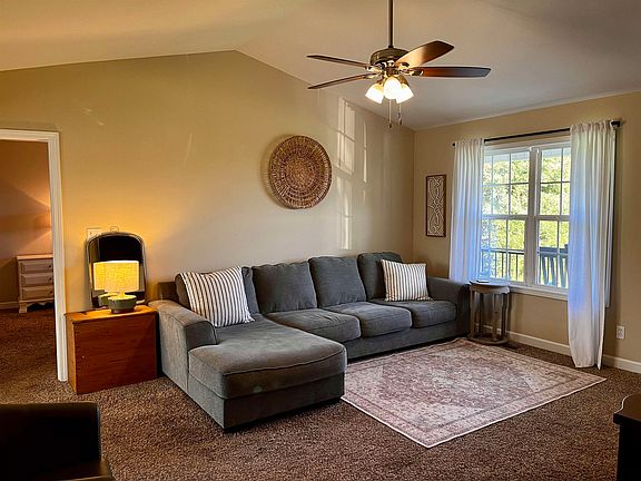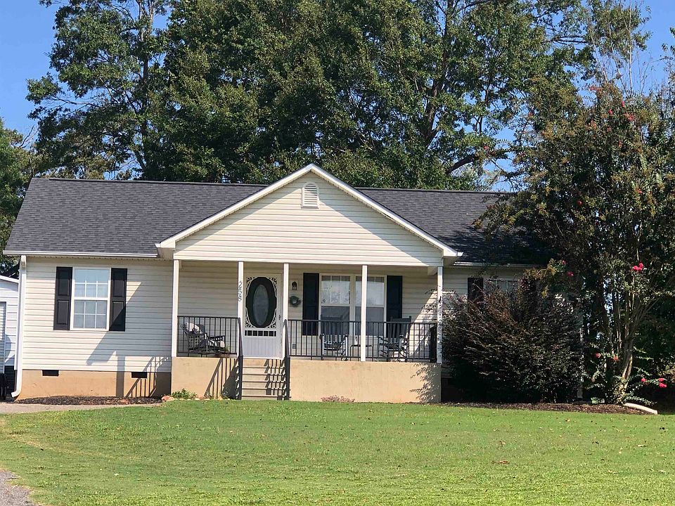 Dist. 2 - Super cute home available with 3 bedrooms and 2 baths - Large lot will allow you to live with no HOA - This vinyl sided home with heat pump, front porch and rear patio sits upon the hill overlooking Lake Blalock - Wrought iron handrails on porch and screen door adding character to the entry - The back yard borders a larger tract of land and has adequate privacy for your outdoor time - The garage / shop, 20'4 x 20'4, was added by current owner and provides a great hobby spot or parking for vehicles - As you enter the front, sizeable den greets you, with cathedral ceiling, open to the dining area with chair railing - Picture window creates natural light in the kitchen - Stainless/black appliances include range, dishwasher and microwave that will convey - Updated light fixtures add to the coziness of this eat in area - Split floor plan with primary bedroom having private bath and large closet plus ample space for king size bed - Down the hall two spare bedrooms, one with a walk in closet, share a 2nd bath -Roof was replaced, new railing on porch, and range installed approx. . 2019. Don't miss this one!