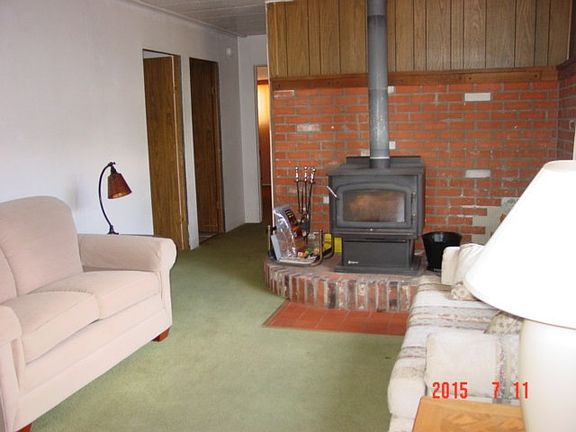 This cozy home is located on a .27 acre corner lot w/ large pines & apple trees. Has a fenced backyard & plenty of storage: 2 lrg sheds & wood storage. Comes furnished. Interior has been drywalled. The kitchen has a newly tiled counter & flooring. Stay warm in the winter with 3 types of heating: monitor oil stove, woodstove & propane. Bonus sunroom opens onto the trex deck off the front w/ a view of the mtns and Delleker pond. The oversized garage has a shop area & is wired for 220. It also has a woodstove.