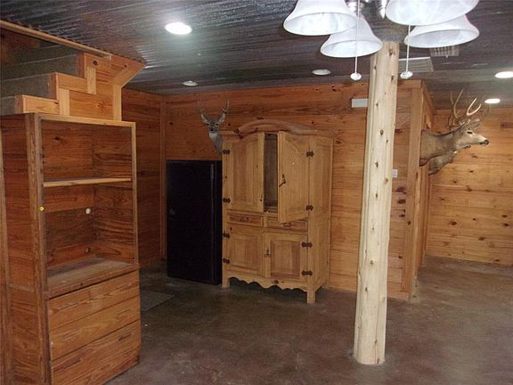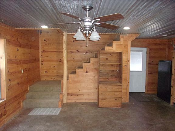 5 acres with nice oak trees, 2 bedroom 2 story metal and wood home. Wood interior walls, metal ceiling in living room and kitchen, 2 bedrooms upstairs with wood walls and ceiling. Small fenced back yard, 3 storage building, large covered deck.