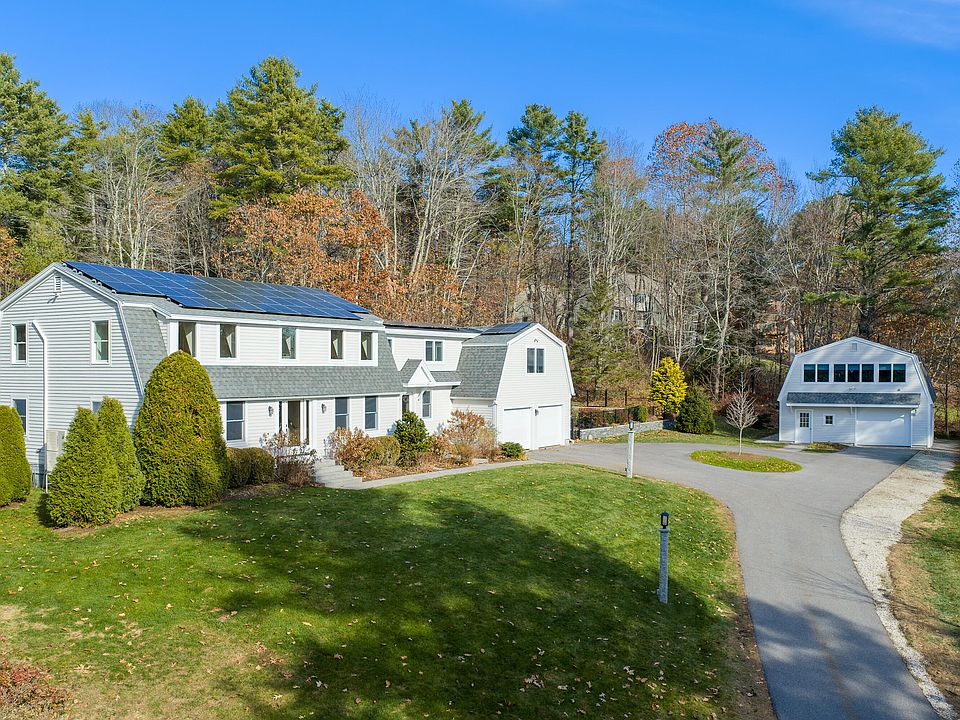 Perched atop a private, wooded hill in coveted Cumberland Foreside, this distinctive property blends refined living with exceptional flexibility. Thoughtfully renovated in 2015/2016, the main residence showcases a sun-filled first floor with a stunning great room overlooking the curated rock garden, flowing seamlessly into a spacious screened-in porch with tranquil views of the 'Robin's Nest' natural swimming pool. The custom kitchen opens to an expansive dining area ideal for entertaining, while a dedicated study and a first-floor office/bedroom offer versatility for today's lifestyle.
