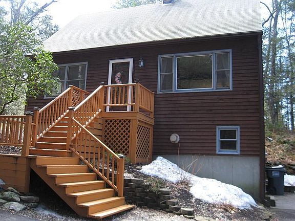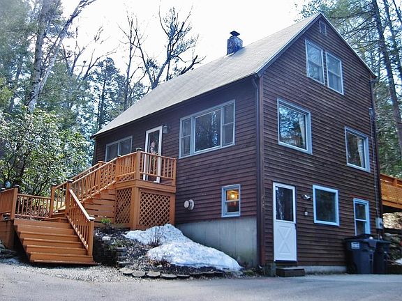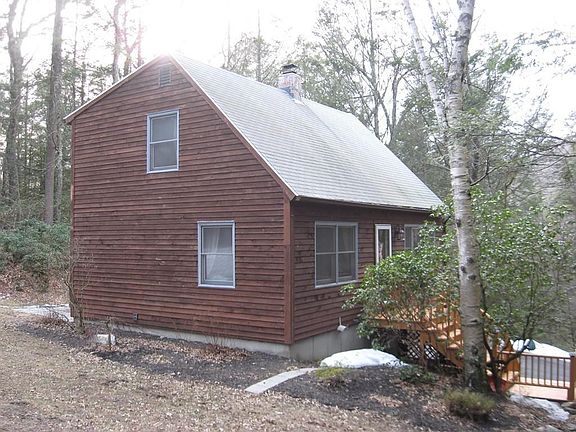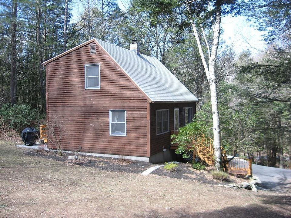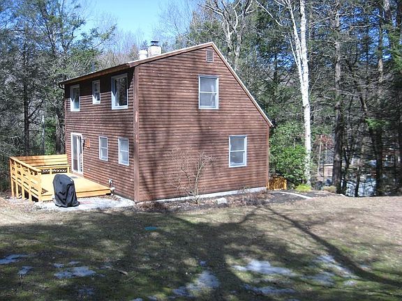 Beautiful Cape style home nestled in it's own private, peaceful setting. Nature abounds in this mostly wooded lot with enough open land for kids to roam or for some gardening. While sitting out on the deck you will love the tranquility and sounds of the babbling brook across the street that will just relax you after your day. Inside you will find a home that is wonderful for entertaining. Family room flows through the dining area to a recently remodeled kitchen with new cabinets, back splash and granite counter tops. The wood stove in the family room warms this home perfectly for those colder New England nights. Two great sized bedrooms upstairs with large windows for natural light. Down stairs you will find the 3rd bedroom with same gorgeous wood floors seen throughout the entire home. Walk out basement goes straight to the driveway. You will be minutes to Amherst Center, bus routes and Colleges in the area.