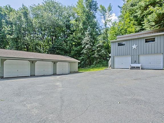 Enjoy the serenity of this beautiful 4-story contemporary home located on a secluded lot with nearly 3 acres of land. From the picturesque wrap around front porch, to the attached 3 car garage and additional detached heated 2 car garage with finished second floor, this home has it all! The large kitchen with stainless steel appliances features a huge pantry and flows seamlessly into the dining room for easy entertaining. The dining room overlooks the open concept living room which has 2 working fireplaces and cathedral ceilings. Travel up to the fourth story and find the master suite complete with a private balcony and master bath with a Jacuzzi tub. Additional features include, central air, hardwood floors and a spacious, well manicured flat backyard perfect for your next BBQ. Abutting the 16th hole of the Ranch golf course, you will not want to miss this home!