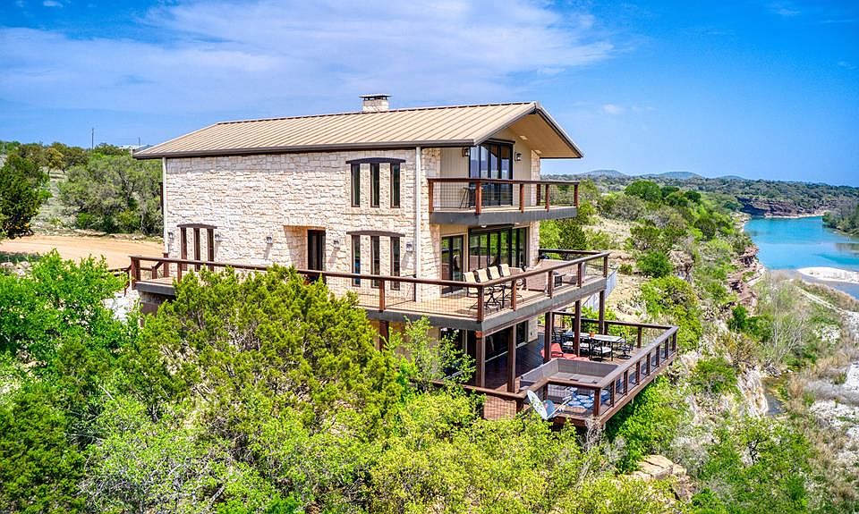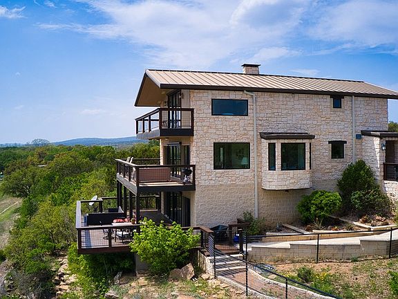 The Cliff House near Mason not only offers spectacular views of the confluence of the Llano and James River from three different floor levels, but also provides outstanding living amenities. The steel structure, stone exterior and metal roof instill a sense of character and permanence. Spacious master bedroom/bath on one level. 2 bedrooms and 1.5 baths on another. An elevator eases transition from one level to another. Engineered Hickory wood floors on level 2. Electric screen and shades on patio doors. Sunbrella cushions in breakfast nook with picture window.