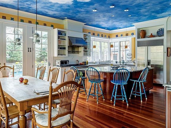 Circa 1872, this Victorian home has been renovated and expanded with quality finishes including Brazilian cherry floors, African Rosewood trim, and wainscoting. A two-story clerestory leads to the living room with radiant heated floor and a stone fireplace. The kitchen features an island, breakfast area, barista, pantry, and bar; it leads to a family room with another fireplace and a dining room. Also on the first floor is a library with bay windows and a marble fireplace. On the 2nd level is a luxurious master suite with two dressing rooms, a spa-like bath, and laundry. There are 3 more bedrooms on this level and 2 more baths. The third floor has 2 bedrooms, a bath, and laundry. The lower level has a playroom, bath, and theater. A mudroom connects the house to a pool house featuring a bar, office, gym, and access to the garage. Sited on an oversized landscaped lot there is an outdoor pool with a heated terrace, year-round hot tub, and outdoor fireplace. Near MA Pike, commuter rail.