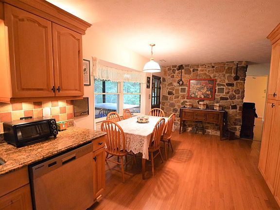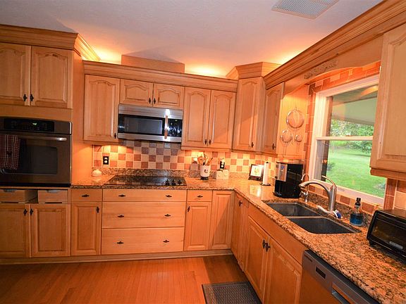 Lovely all brick home in a partly wooded setting with views out over the valley. This spacious home features 5 bedrooms 3.5 baths, living room with stone fireplace, remodeled kitchen with granite counters & new appliances, screened porch off the kitchen with hot tub, generous rec room, wet bar, pool table,2 car garage plus detached two car garage/shop/man cave, spectacular sunsets, private setting.