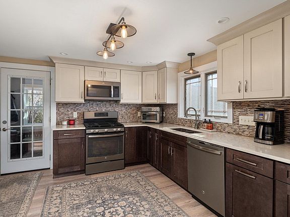 This delightful 3-bedroom cape provides the perfect combination of comfort & tranquility, complete with a spacious yard, immaculate 1-bedroom in-law suite, & impressive garage/shop complete with 12.6’ ceilings & compressor lift. Well-maintained & thoughtfully designed, this home exudes a cozy & peaceful atmosphere. The living room boasts beautiful bay windows that fill the space with natural light throughout the day, vaulted ceilings, & a wood-burning fireplace. The updated kitchen showcases functional, spacious cabinetry, stainless appliances, & quartz counters creating a fresh, clean, modern space. The kitchen flows directly into the ample dining room, resulting in a wonderful open layout. On the first floor, you'll find a versatile room, currently being used as an office, along with a full bathroom. Upstairs, 2 bedrooms & another full bath provide comfort & privacy for all. The lower-level walkout basement has been transformed into an incredible 1-bedroom, 1-bathroom suite that has been thoughtfully improved and meticulously maintained. This property offers outstanding potential for an accessory dwelling unit (ADU). Whether you’re looking to generate rental income, create a private guest space, or design a dedicated home office, this opportunity adds immense value and versatility. Outside, the property boasts a surprisingly private 2.33 acres complete with a large shed and tasteful fencing. Discover the ideal combination of comfort & value in this country home.