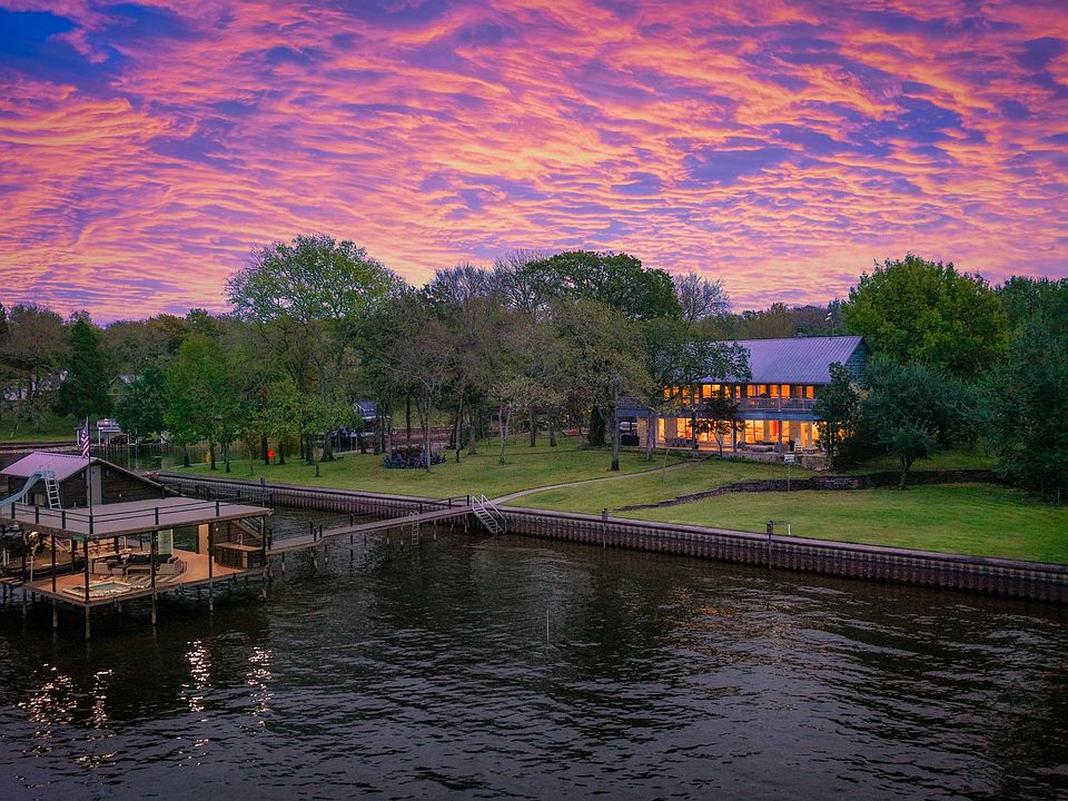 Designed for lake living, the floorplan captures water views from nearly every room. Spacious and inviting, the home is ideal for hosting family and friends with five bedrooms, five baths, and a large bonus room. The main level features a beautifully updated kitchen with a large island, six-burner gas cooktop, granite countertops, and double ovens, opening to the dining and living area with a stone gas fireplace and durable LVP flooring. Two remodeled waterside ensuite bedrooms—including the primary suite—are located on the main floor, along with a third full bath and a brand-new bunk room offering two queen bunks with twin tops perfect for hosting younger guests or adults. The second level includes two additional ensuite bedrooms and a game room with a wet bar, all opening to a full-length balcony overlooking the lake. The home comfortably sleeps 18+ and is designed for effortless entertaining, with expansive outdoor living on both the covered main-level patio and the upper balcony. The boathouse includes two full-size slips, a spacious covered sitting area, fish-cleaning station, composite party deck with slide, storage room, and a separate fishing pier.