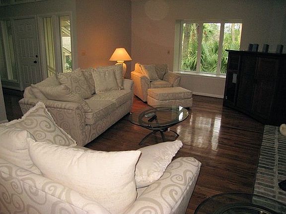 Owner financing available. Vaulted ceilings in living/dining area. Totally gutted and renovated kitchen opens to family room. New hardwood floors throughout, bathrooms updated,exterior recently painted. Large Carolina room currently being used as 3rd bedroom. Oversized bedrooms in home. Private, fenced courtyard betweendetached two-car garage and home. Great location on the island.