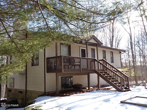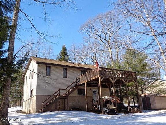 AFFORDABLE 'Move in Ready' vacation or investment property. Backs up to forever green lands!4 bdrs, 2 full bths, open concept KIT/Dining/LVrm w/ fireplace, hardwood and ceramic floors, game room, family room, and central air. House sets back from road and has a circular driveway, level back yard and utility shed. Large back deck w/mountain views, plus covered front porch. Very popular year round full amenity community with motor boating lake, beach, outdoor pool, tiki bar, Ski Lodge and slopes, horseback riding, petting zoo, 4 wheeling trails, picnic access area on the Delaware River and much more! Commutable distance to NYC and major metro areas.