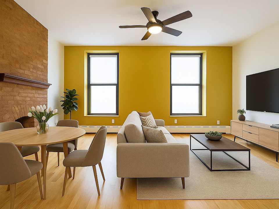 - Bright living area with large windows, exposed brick, and room for dining.