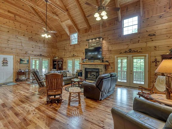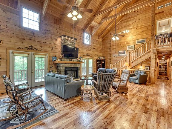 This truly stunning real log home is one you must see to appreciate. The impeccable craftsmanship is apparent from the moment you step up onto the three-sided wraparound porch. Grab your favorite beverage and your favorite person and pull up a rocking chair and relax while bird watching and enjoying the many flowers that bloom this time of year. Step inside your mountain oasis and you'll immediately see how lovingly this home has been cared for. The massive great room has soaring wood ceilings, gas log fireplace, dedicated dining area and a kitchen that may very well become the focal point of the home. There is a ton of cabinets, granite countertops, a chefs-style appliance package and more. Your new home features FIVE bedrooms (yes we counted correctly), FOUR full baths and one half bath. That includes not one but two primary/owner suites - one on the main level and one on the upper level. Each one features a private en-suite with garden tub, shower and water closet. Rounding out the main floor is a Bedroom, Bath and laundry/mud room. The upper level has a large open loft area and hallway leading to 2 Bedrooms, Bath and the 2nd primary/owner suite. The lower level has a huge living area with 2nd gas log fireplace and built-in bookcases, walk-in pantry styled storage room, media room, two bonus rooms great for offices, game room complete with ping-pong table, half bath and equipment room. Love outdoor gathering? There's a grill deck off the main level and the 2.23 acre lot has lots of beautiful flower beds and fruit trees as well as a full-hookup area for your RV. Some furnishings may be included. This lodge-style property has so many possibilities!!!