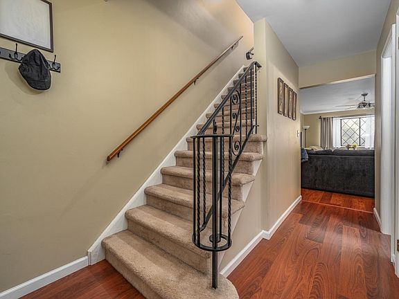 Beautifully updated North facing townhouse in Wildflower Village; Renovated kitchen with honey maple cabinets featuring glass front accents, multi level pull out drawers & wine rack, full pantry and newer stainless steel appliances; wide plank laminate floors & trim throughout the home; renovated baths with modern vanities, fixtures & ceramic tile; full finished basement; private yard with views of mature landscaping for outdoor enjoyment. The home boasts spacious rooms with walk in closets and plenty of sunlight.
