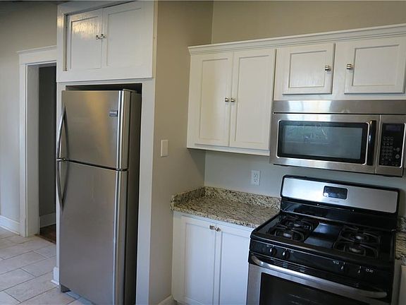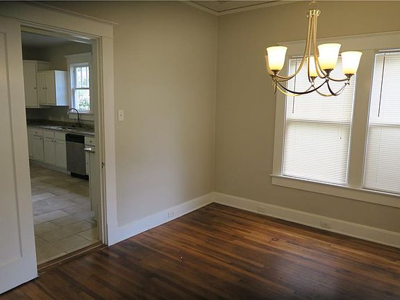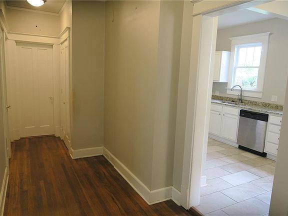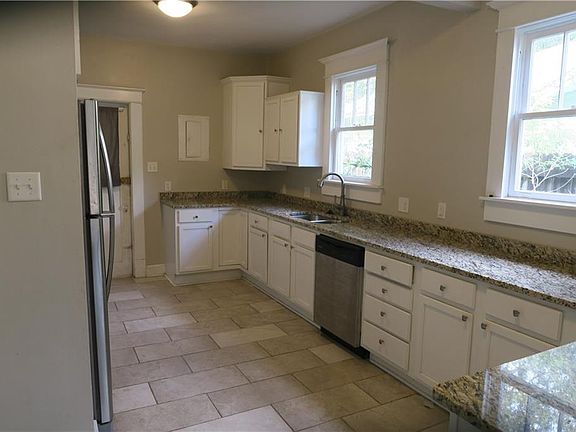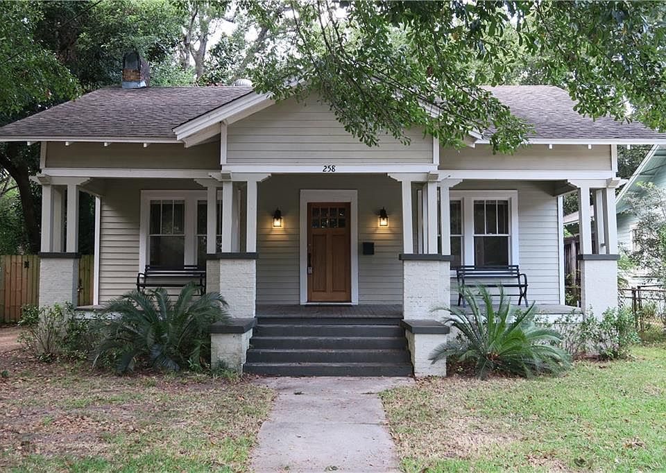 Renovated Midtown Cottage (2015), Open front porch, large kitchen with custom cabinets, granite counter-tops, stainless steel appliances, tile floor in kitchen, original hardwood floors, recessed lighting.