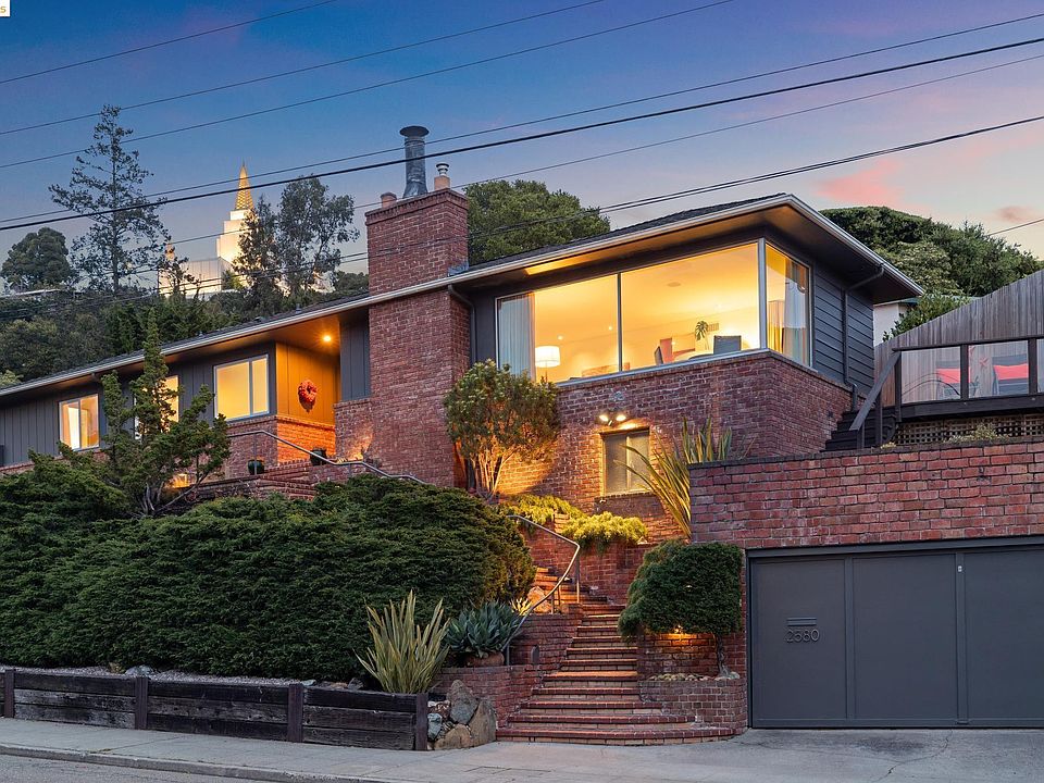 Mid-century modern retreat in desirable Lincoln Highlands w/ views & privacy! Single-level home combines laidback cool of Californian mid-century design w/ indoor/outdoor flow, all set against a backdrop of captivating Sutro Tower, & bay views. Architect-owned for 27 years, it artfully blends original 1952 details w/ modern upgrades. Brick-&-mortar meets-board-&-batten exterior, walk up brick steps to entryway w/ sweeping light-filled living area appointed w/ fireplace, built-in entertainment center, & large corner windows w/ city light views. Remodeled kitchen features marble c-tops, Viking appliances & casual breakfast nook. Formal dining area opens to private backyard sanctuary w/ multiple seating areas & deck all surrounded by mature landscaping & captivating bay views. Sun-lit primary suite beckons w/ oak floors, art shelving, abundant closets, & dressing room, plus a spacious ensuite bath w/ large vanity, abundant storage space & cleverly designed side-by-side W/D w/ folding countertop. Completing the layout: well-appointed 2nd bedroom w/ separate office space, hall bath & a 2-car garage w/ workshop. Prime location in Oakland's hidden gem hillside neighborhood w/ access to convenient access to parks, East Bay hotspots, & Highways 13 & 580. Not to miss.