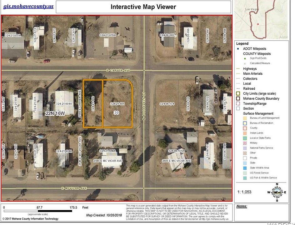 2 building lots on a nice corner. Sale includes parcel 324-21-602 for a total of .35 acres. Electricity and water line to the lot. Close to the Mohave Community College campus.