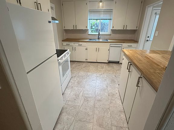 Electric stoveButcher block countersBar seating counterThree good sized bedroomsCeiling fans in bedroomsFull size washerFully fenced large backyard