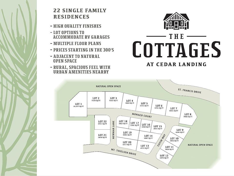 New construction in East Medford by Clason Company! Single level home to be built in The Cottages at Cedar Landing. This home will feature an open floor plan, 3 bedrooms, 2 full bathrooms, approx. 1523 sq ft and is certified Earth Advantage Platinum for maximum energy efficiency. Earth Advantage built homes incorporate design elements, systems and materials that create superior indoor air quality, uses natural resources responsibly, protects land, and lowers water and power usage. The great room opens to the dining area and kitchen with granite counters, stainless appliances, gas range, eating bar and pantry. Large master suite and master bathroom w/ dual sinks, large tile shower and huge master bedroom closet. High end finishes include beautiful hardwood floors, tile bathrooms, tile laundry room and custom built-ins. Front and back yard landscaping, drip system and fencing are included. Proposed 2.91 miles of trails and over 20 acres of open space including a 5-acre city park.