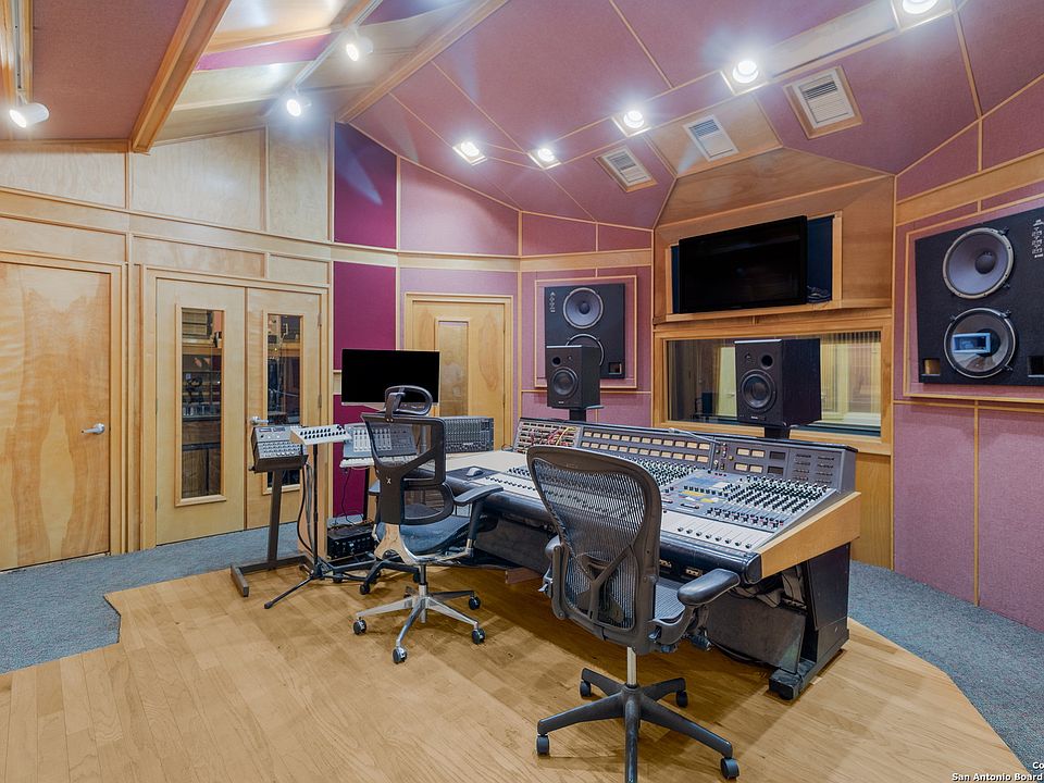 Step inside one of San Antonio's most distinctive properties - a musician's dream and private retreat all in one. Originally featured in Mix Magazine's Class of 2002, this acoustically engineered recording studio was designed by renowned acoustician Jack Piercy with audio installation by RB Blackstone of Sound Madness. Built to exacting professional standards, the 2,270 sq ft facility includes a 500 sq ft Live End Dead End (LEDE) live room, 290 sq ft control room with a vintage Neve console, 2" tape recording, and a Pro Tools Ultimate HDX setup (32 channels in and 32 channels out). Five isolation booths, a green room lounge, dedicated office, half bath, and ample storage make this a fully turnkey studio - ready for tracking, mixing, and mastering. Expert soundproofing and studio-grade construction greatly reduce sound transfer, allowing both creative flow and household peace to coexist. Beyond a discreet private entrance lies the 3,576 sq ft custom residence - seamlessly connected yet completely separate in feel. The home offers four spacious bedrooms, two and a half baths, and a private office overlooking 1.77 wooded acres in a gated, guarded community. Inside, the formal living room makes a bold statement with its floor-to-ceiling brick fireplace and double sliding glass doors leading to the main deck and sparkling pool. Upstairs, the modern kitchen glows beneath a central skylight and opens to an expansive family room with an elevated deck showcasing breathtaking hill country views - perfect for quiet mornings or late-night jam sessions under Texas skies. The primary suite and office are tucked away for peace and privacy, striking a perfect balance between creativity and comfort. This property isn't just a home - it's a creative compound and a one-of-a-kind opportunity to live, work, and create without compromise.