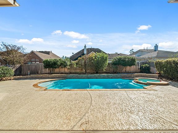 Beautiful 2-story Lennar home with sparkling pool offers outstanding curb appeal and inviting front porch. Featuring 4 bedrooms and 3.5 baths, this spacious layout is thoughtfully designed for comfortable family living. Open foyer leads to formal dining room and private study with double French doors. Chef’s kitchen boasts wood cabinetry, breakfast bar, granite countertops, stylish tile backsplash, and connected breakfast room, all flowing seamlessly into the large family room with cozy corner fireplace overlooking the outdoor oasis. Primary suite is conveniently located downstairs and includes ensuite bath with double sinks, soaking tub, separate shower, and huge walk-in closet. Upstairs offers three secondary bedrooms and versatile game room. Outside, enjoy covered patio and sparkling pool with attached spa. Ideally located just minutes from The Woodlands and zoned to Klein ISD, with easy access to parks, pools, golf, splash pad, Auburn Lakes Rec Center, and easy access to I-45 & 99!