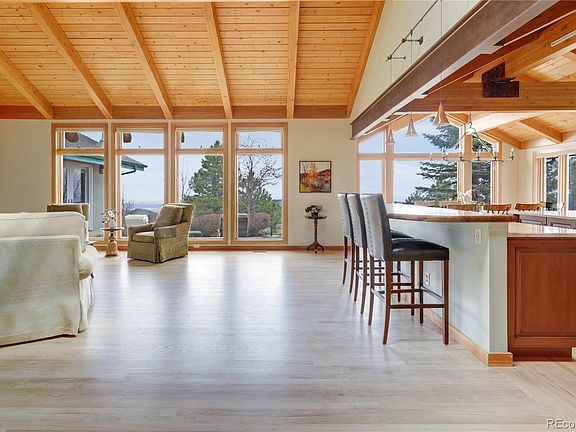 Expansive Views, Main Floor Primary Suite, Guest or Caretaker Suite, High End Finishes and Oversized 3 car garage with separate gear room/work area. This dream retreat nestled in the scenic Front Range foothills is only 25 minutes to downtown Denver, 15 minutes to Golden and 40 minutes to the Loveland ski area. The heart of the home is the great room featuring vaulted wood ceilings, hardwood floors, fireplace & wall of windows that opens onto a stone patio with panoramic views. The kitchen is a culinary dream, professionally designed (EDK) designed kitchen with natural stone counters, cabinetry, prep sink, custom tile backsplash & walk-in pantry. Host dinner parties or casual meals in the dining room with views in every direction and perhaps an elk or deer passing by. The home office is an inspiring workspace with custom shelving. Enjoy sunrise views of the mountains and city from the private primary suite retreat with hardwood floors, fireplace, & direct patio access. The primary bath is like your personal spa with a soaking tub & walk-in shower. Two additional bedrooms are located on the main level with jack & jill bath. The powder room features a unique live-edge wood vanity & stone sink. The laundry/mud room has built-ins to simplify daily living. Looking for an in-law suite or space for a returning grad? The lower level offers incredible flexibility. The main room is currently a dance or fitness room with a wet bar & entertainment area. The lower-level guest suite is complete with a custom Murphy bed. Plus, the home has a 10-kilowatt privately owned solar system. Mount Vernon offers a rare Colorado lifestyle with open spaces, trails, abundant wildlife, & a strong sense of community. Residents enjoy a clubhouse, fine dining, pool, tennis courts, & horse facilities. Ralston Elementary is nearby. The $496 HOA fee includes a Social Membership, with additional packages available.