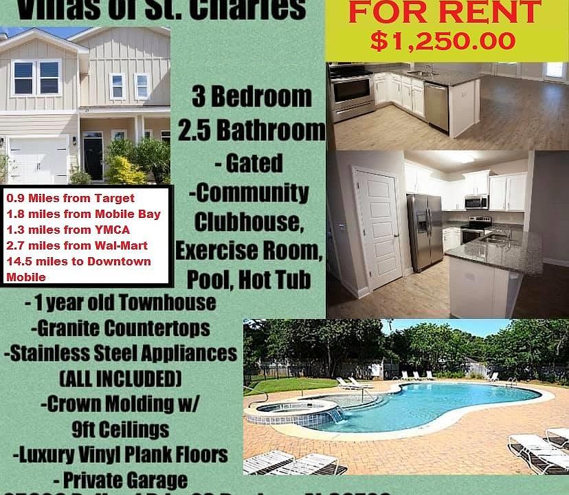 Rental includes amenities such as: gated community, clubhouse, free landscaping, exercise room, pool, hot tub, granite counter tops throughout house, cabinet hardware, plank floors, stainless steel appliances (refrigerator, dish washer, stove, and microwave), private garage, washer and dryer. Unit is conveniently located 0.9 miles from Target, 1.3 miles from the YMCA, 1.8 miles from Mobile Bay, 2.7 miles from Wal-Mart, 14.5 miles from downtown Mobile.