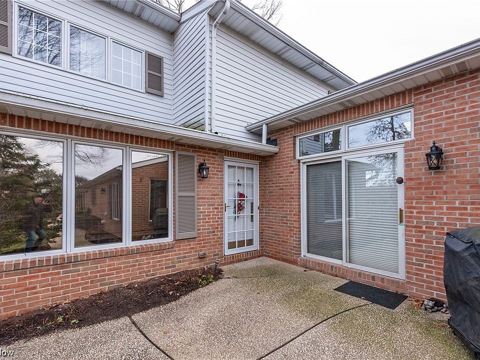 Exquisite 3 bedroom townhome affords privacy and green space at Falmouth Place. New HVAC Dec. 2023. The spacious great room has beautiful refinished hardwood floors, recessed lighting, a vaulted ceiling and wood burning fireplace with flanking windows. Two sets of doors open to a large private patio. The updated kitchen includes white cabinetry with brushed nickel pulls, quartz island, porcelain tile floor, SS appliances (except MW) and opens to a charming eating area with slider to the front patio & includes see thru fireplace, vaulted ceiling, and skylight. The cozy family room off the kitchen has built-in bookcases flanking a double window and brick fireplace with glass doors. The first floor laundry room leads to an oversized two car garage. There's also a remodeled half bath with decorative tile wall. The first floor primary bedroom has a two large double windows, vaulted ceiling, fan and walk-in closet. The large ensuite bath offers a double vanity, separate shower and linen closet. Upstairs are two large bedrooms, storage closets and a full bath with skylight and tub/shower combination. Tucked away in Fairlawn, this small enclave allows easy access to shopping, highways, restaurants and parks.